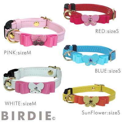 上質でシンプルなデザインの本革製ワンタッチタイプの首輪 ゴールドのBIRDIE刻印が施されたチョウチョとリボンがキュートなアクセントになる軽快な首輪です どんなワンちゃんの毛色にも映える4色のカラーバリエーション Made in Japanならではの長く使える品質とデザイン、 使い込むほどに愛着が湧いてくる首輪です 17-28cmとサイズ調整もできるので首まわりのサイズがどんどん変わっていく成長期の子犬にも対応できます。